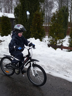 Födelsedagen firades med släkten och massor med presenter bl a en ny STOR cykel. Nu hoppas vi bara att snön försvinner snart, för han lär nog behöva öva lite.